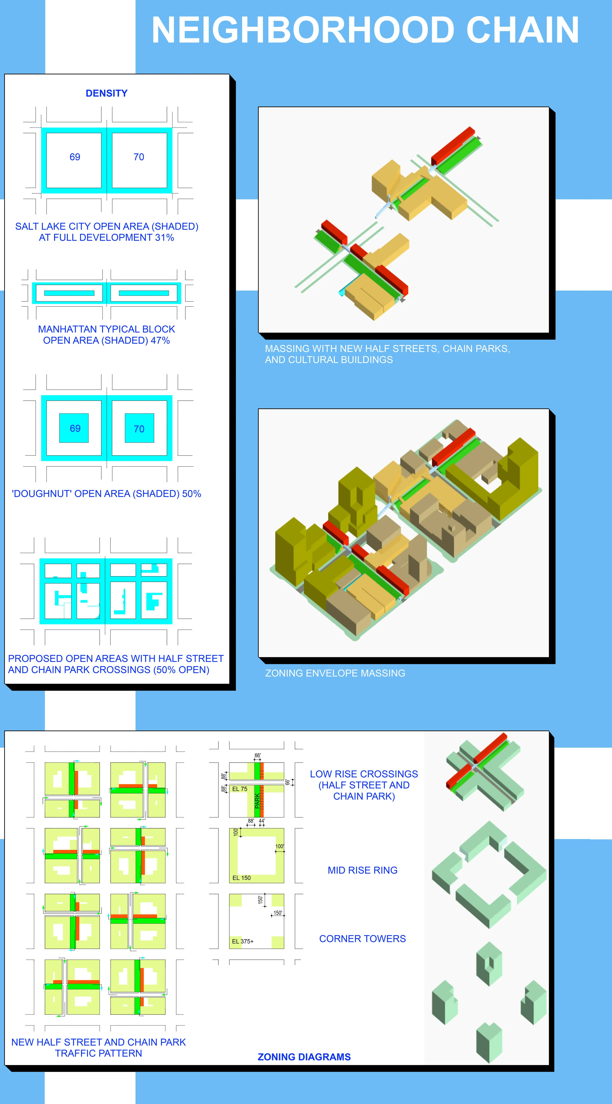 While this proposal ostensibly addresses inner block improvements near a new arts center, we opted to expand the discussion to include zoning and planning proposals. Introducing a new linear midblock park and new crossing midblock alley (each 1 chain x 10 chains) into the typical Salt Lake City megablock creates opportunities for new development, travel, and leisure at a more comfortable scale. We see the Chain Park and Half Street as a kind of small town Village Green and Main Street dropped into the current blocks creating micro neighborhoods strung chain by chain throughout the city.